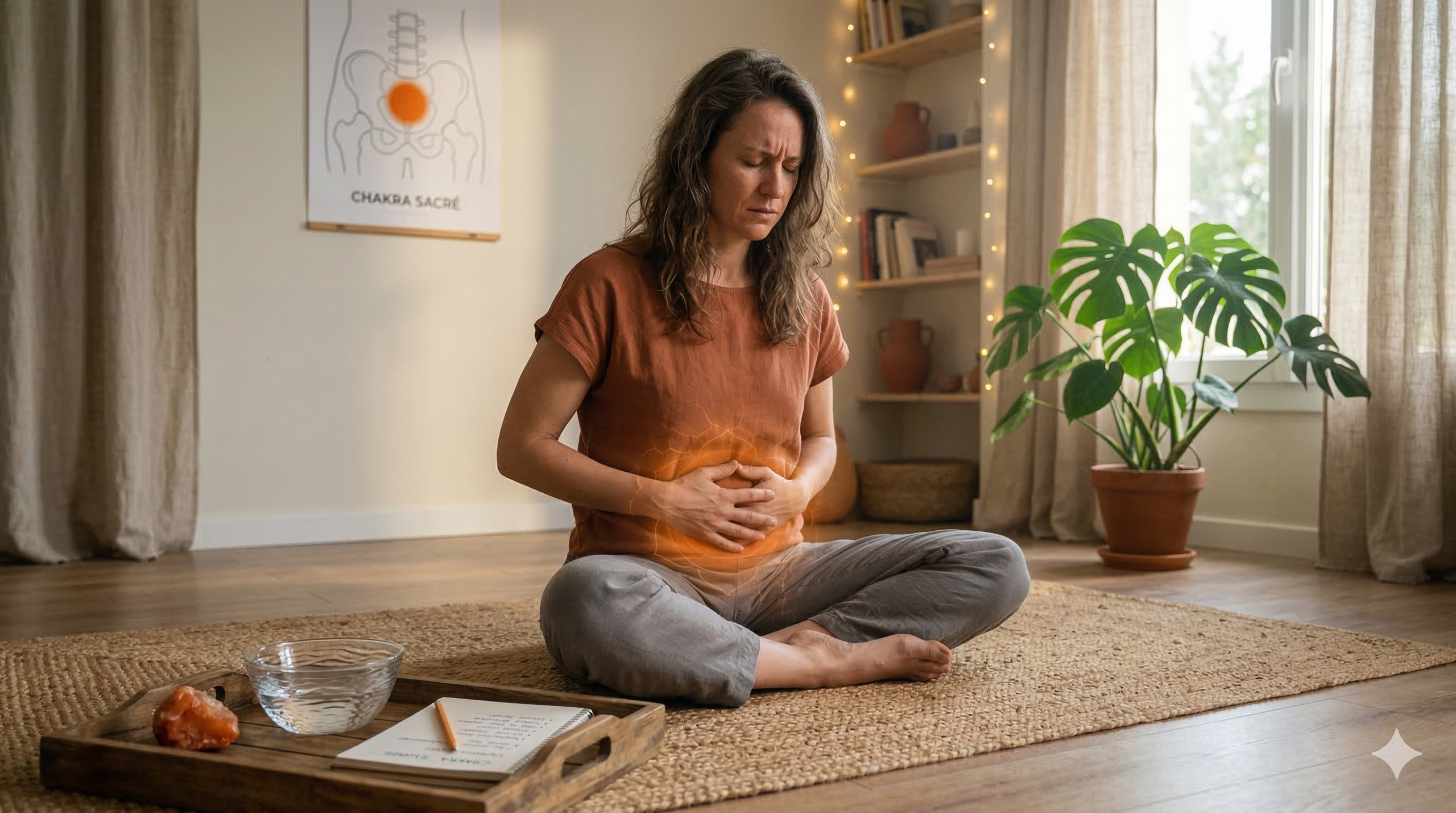 Les traditions énergétiques associent le chakra sacré à certains inconforts physiques. Ces signes ne constituent pas un diagnostic médical.