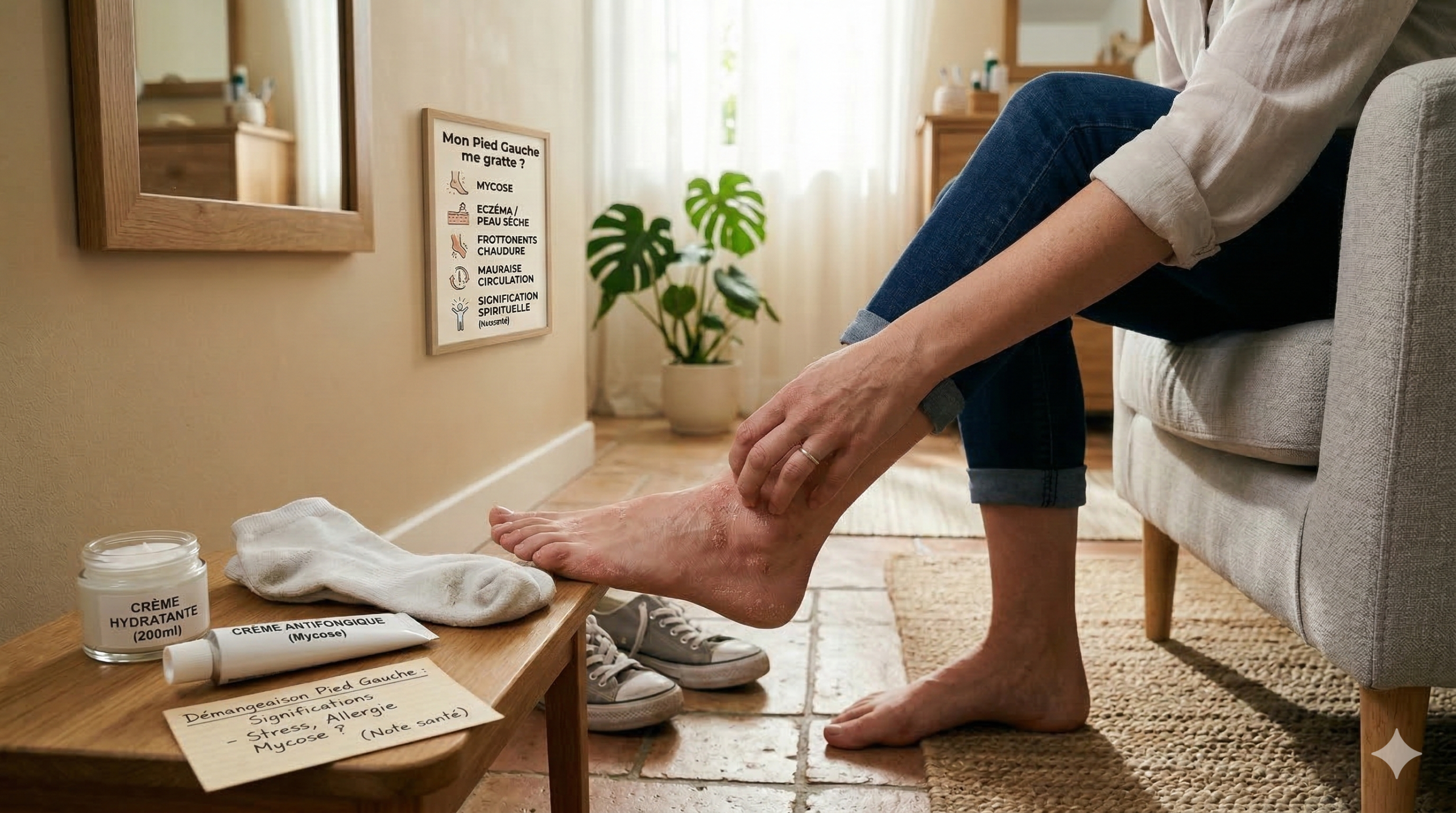 - Un pied gauche qui gratte a le plus souvent une cause physique : mycose, allergie, peau sèche, frottement.